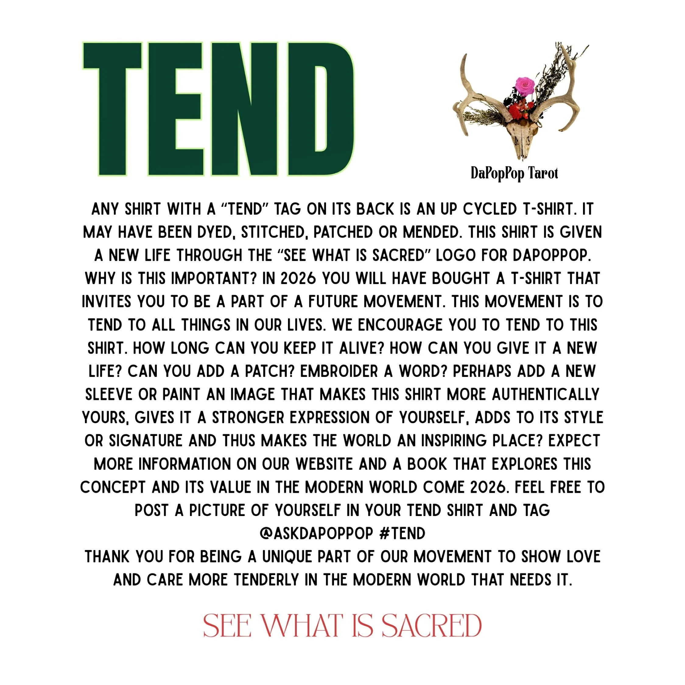 Shop the collection TEND Store SEE WHAT IS SACRED Tshirt (Unisex Small in Dark Green - short sleeve) $30.00 Add To Cart Added! SEE WHAT IS SACRED Tshirt (unisex XS LS Brown) $30.00 Add To Cart Added! TEND - T Shirt RED SS Women’s MEDIUM $30.00 Add To Cart Added! T E N D - T Shirt White Long Sleeve (Gap) Women’s SMALL $30.00 Add To Cart Added! SEE WHAT IS SACRED t shirt. Short sleeve, navy blue, unisex small. $30.00 Add To Cart Added! TEND - Tshirt. Women’s White V-Neck SS $30.00 Sold out Sold Out Added! SEE WHAT IS SACRED Tshirt -Unisex Small White LS $30.00 Add To Cart Added! TEND T-Shirt Off-White/Natural Crew Neck SS Large $30.00 Sold out Sold Out Added! TEND - Tshirt. Women’s Medium White SS V NECK $30.00 Add To Cart Added! SEE WHAT IS SACRED IRON ON $6.00 Add To Cart Added! TEND IRON ON $2.00 Add To Cart Added!
